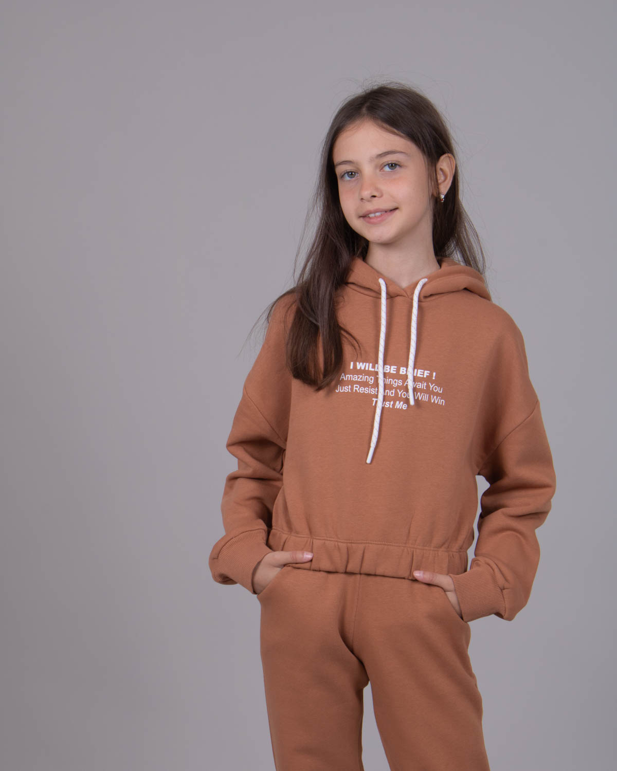 Утеплённый спортивный костюм для девочек в из плотного футера с начесом. Оптимальный объём худи не будет сковывать движений, легко сочетается с верхней одеждой. Худи укороченное на резинке, с объемным капюшоном. Утеплённые брюки на манжетах с боковыми карманами.