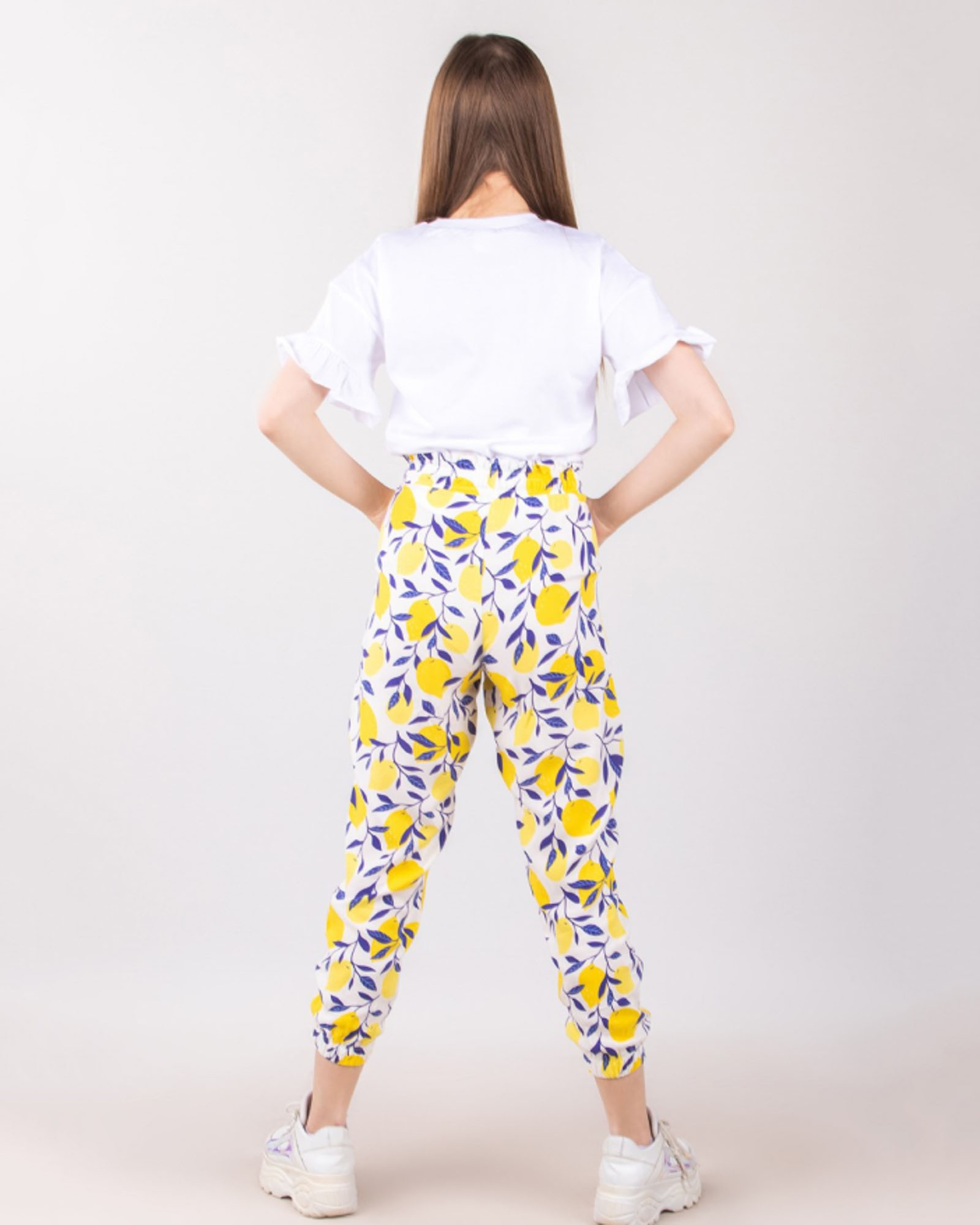 Прекрасный стильный костюм из двух предметов : футболки и брюк из легкого штапеля . Край рукава оформлен воланом. Брюки с боковыми карманами на манжетах. Яркий и актуальный костюм будет незаменимым нарядом в летний сезон.