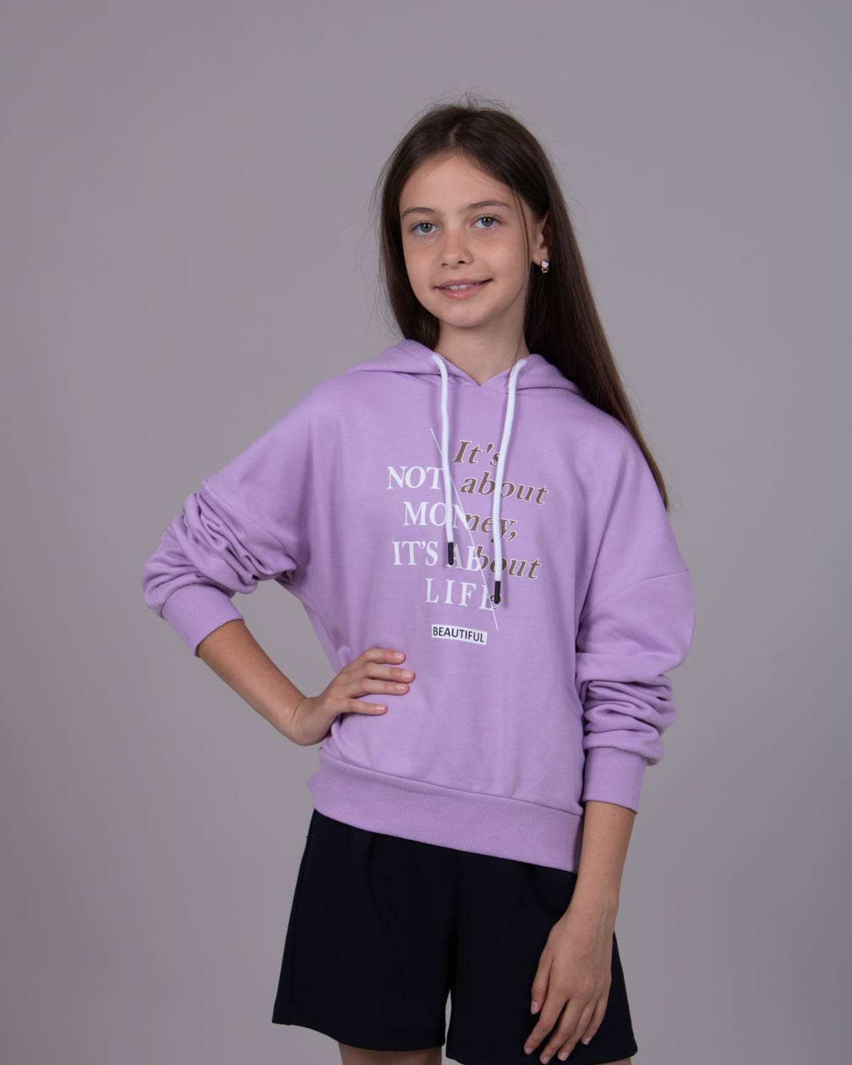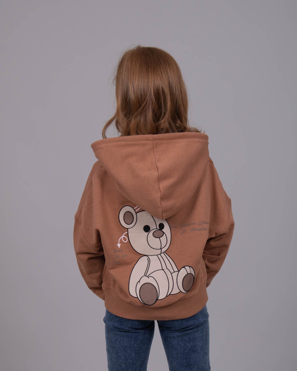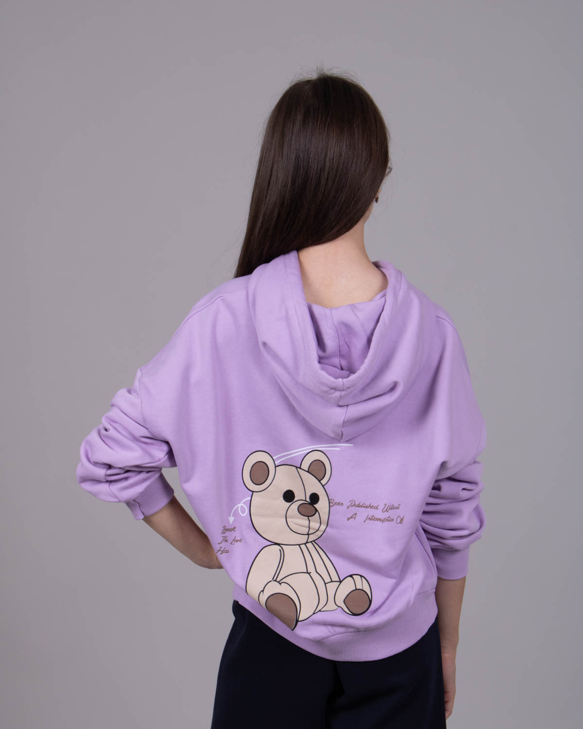 Худи для девочки выполнено из трикотажа - футер (петля). Модель дополнена аппликацией  в виде игрушечного медведя.