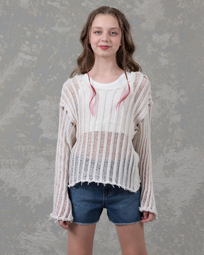 Джемпер DMB для девочек ажурной вязки оптом, выполнен из хлопка. Свободный крой, круглый вырез горловины. Модель отлично сочетается с любой одеждой. Под низ можно надеть удлиненный или короткий топ в тон джемперу.