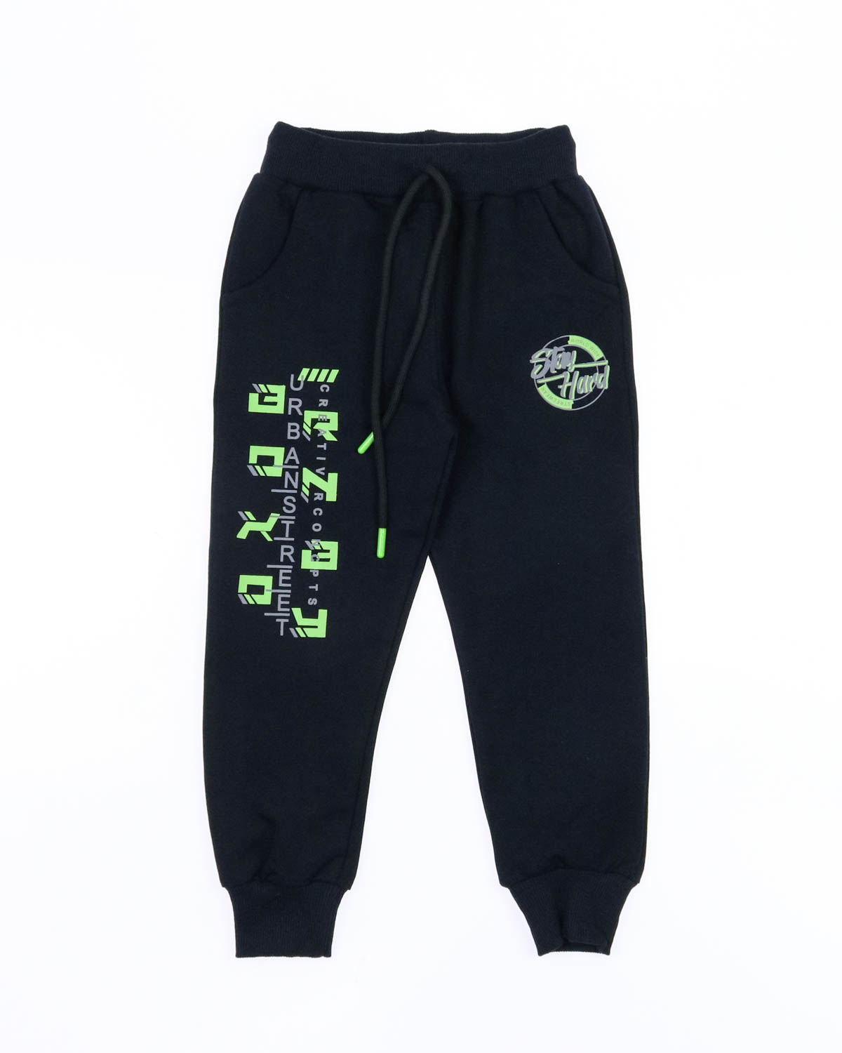 Однотонные брюки из трикотажа для мальчика, прямого силуэта, на притачном поясе с эластичной тесьмой и регулируемым шнуром спереди. Два боковых кармана, по низу брюк цельнокроеные манжеты с эластичной тесьмой.