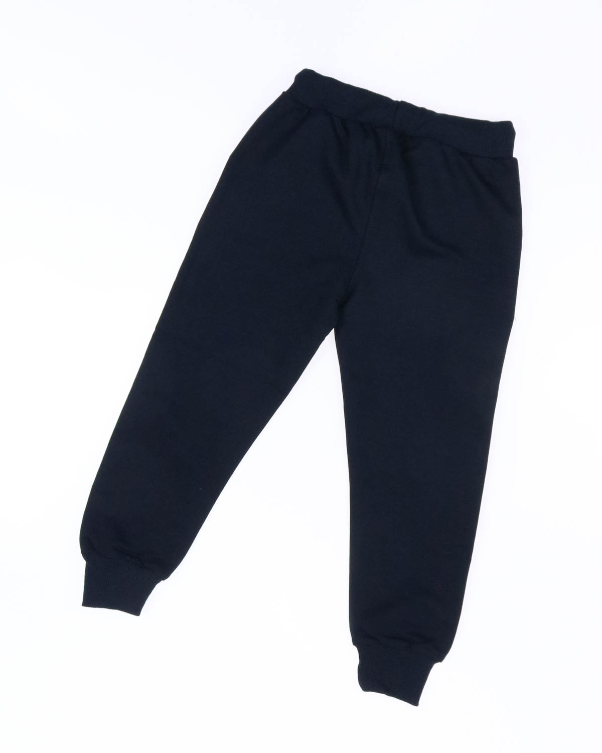 Однотонные брюки из трикотажа для мальчика, прямого силуэта, на притачном поясе с эластичной тесьмой и регулируемым шнуром спереди. Два боковых кармана, по низу брюк цельнокроеные манжеты.