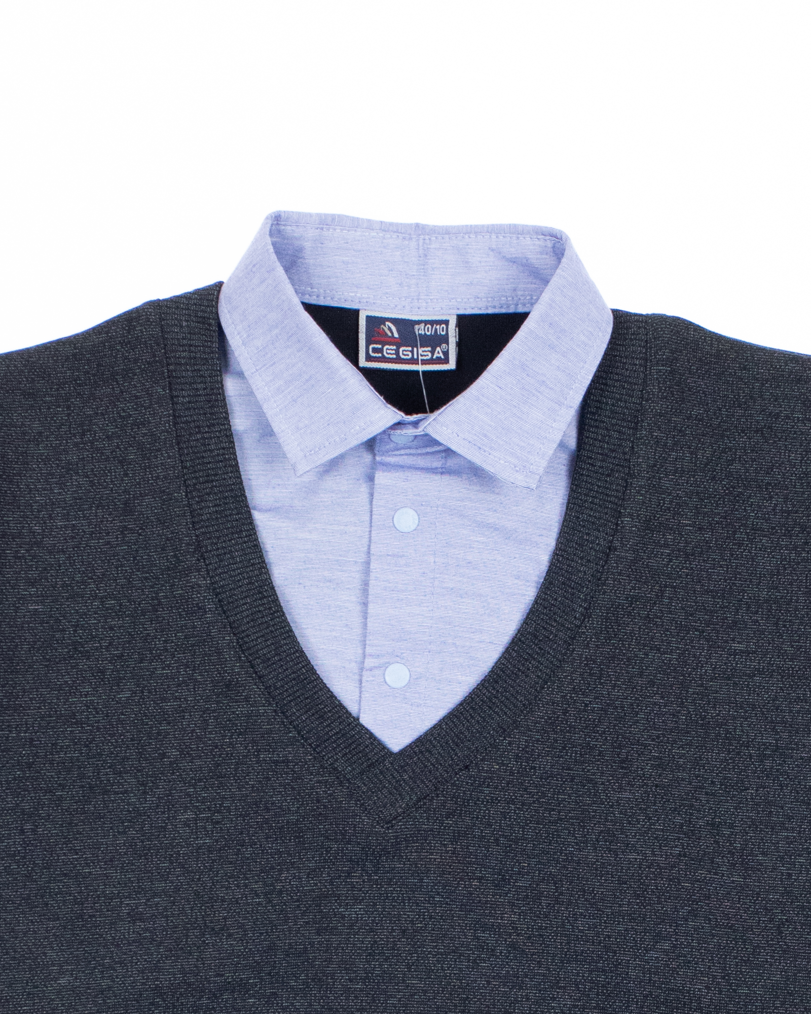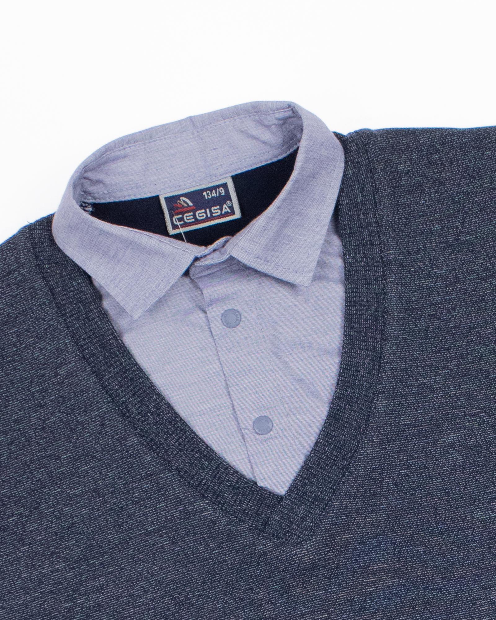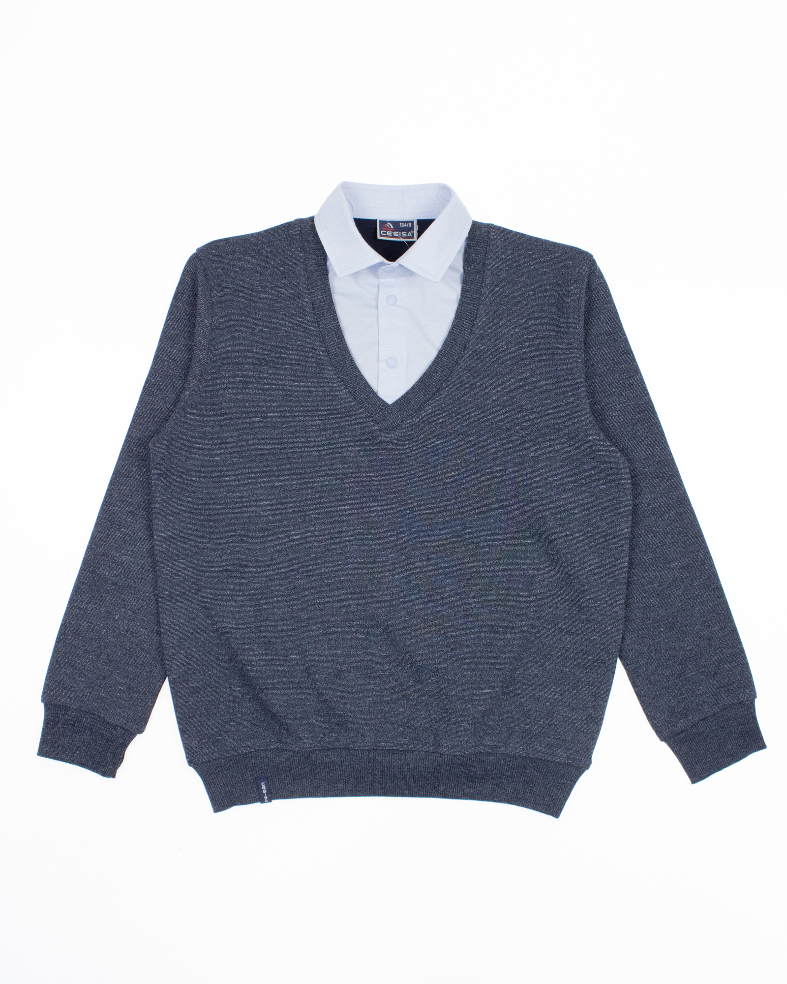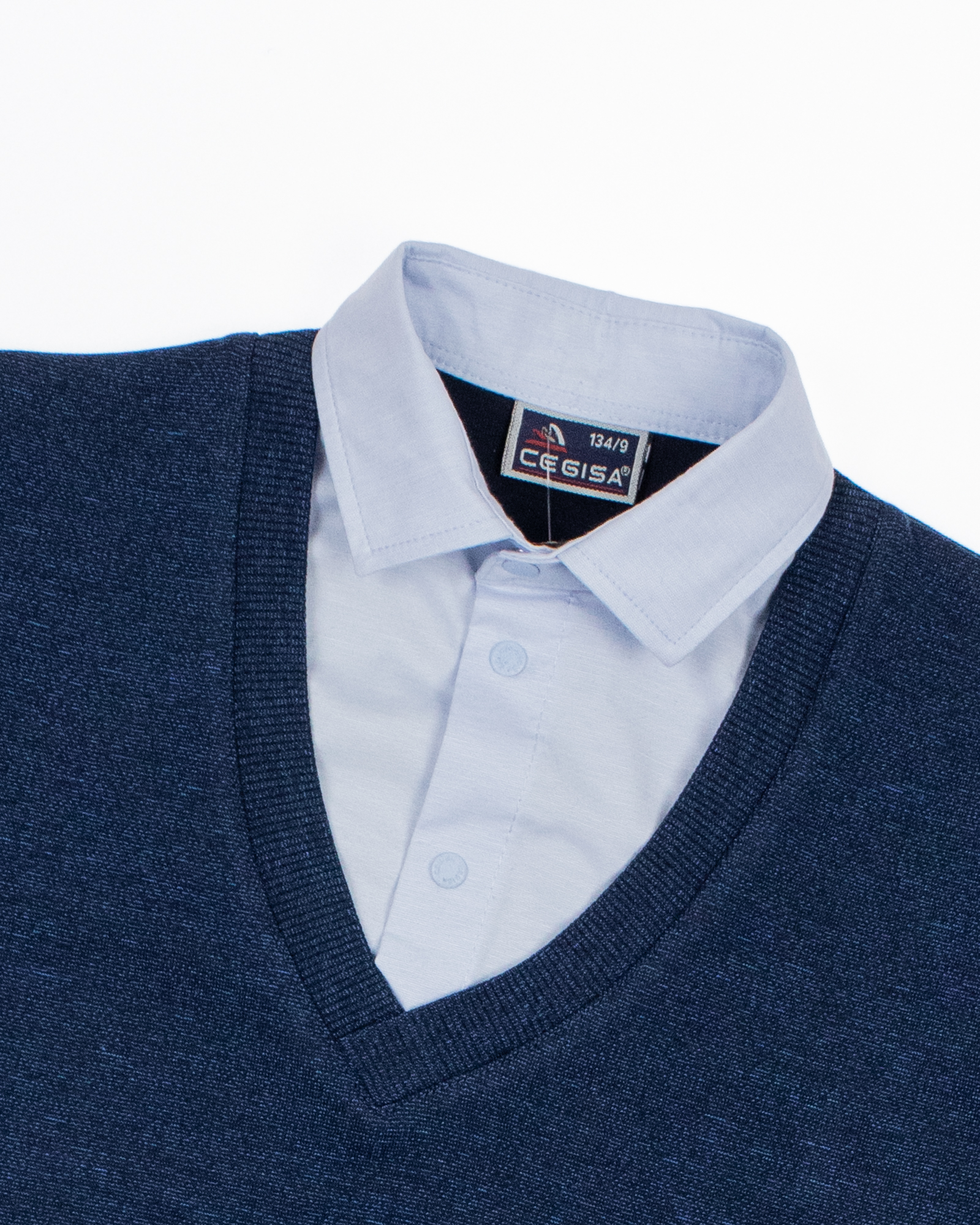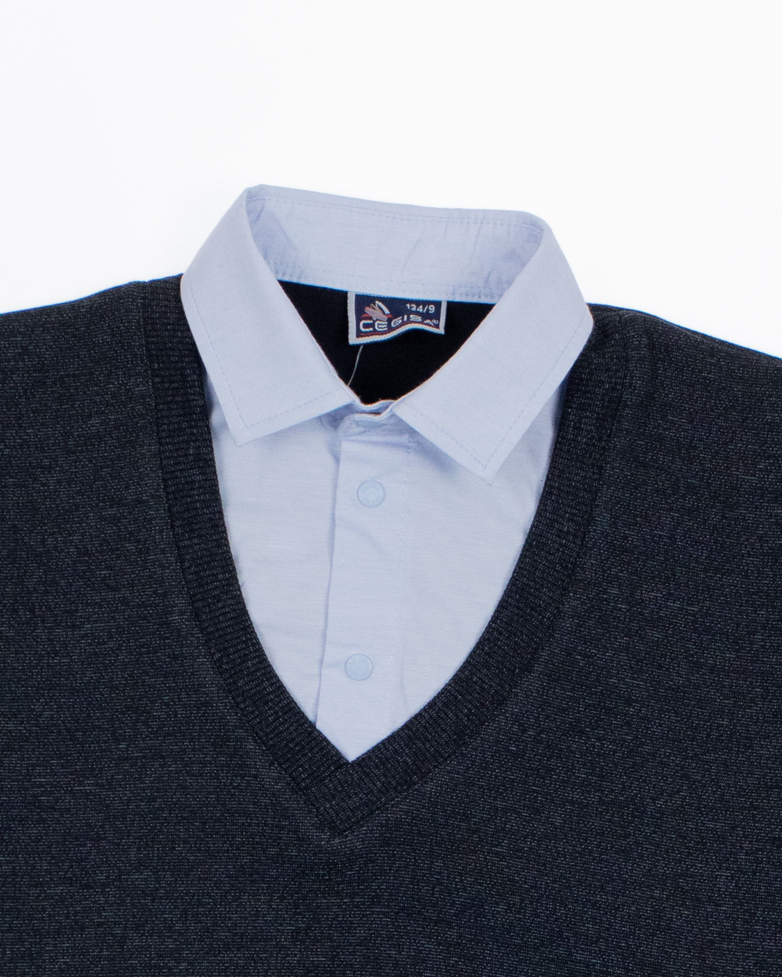 Школьный джемпер-обманка для мальчика оптом с имитацией рубашки выполнен из качественного хлопкового трикотажа с небольшим добавлением лайкры. Ворот сшит из рубашечной хлопковой ткани, застежка-кнопки.  Джемпер-обманка выглядит как полноценный комплект рубашки и джемпера. Мальчик будет всегда опрятен в школе, сохраняя при этом официальный дресс-код. Качество наших изделий подтверждают многократные стирки в стиральной машине, при которых жилет-обманка сохраняет прежний вид, без деформации и окрашивания рукавов или ворота. Торговая марка  CEGISA представляет большой ассортимент качественной, красивой, классической школьной и спортивной одежды турецкого производства для детей и подростков.