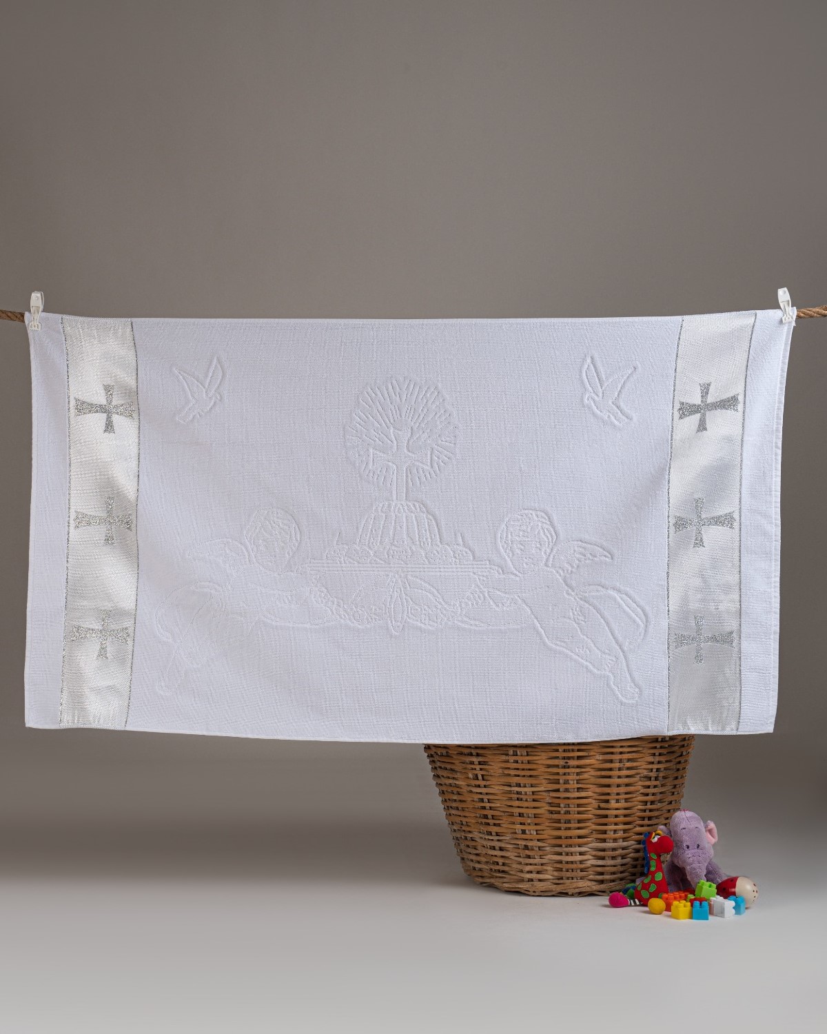 Полотенце  для сокровенного таинства крещения выполнено в традиционном стиле.Белый цвет полотенца для крещения олицетворяет чистоту и невинность, а декор с изображением православного креста символизирует веру и благо. По традиции в крестильное полотенце оборачивают только что крещенного малыша, а затем бережно хранят на протяжении жизни и используют как оберег, наделенный особой силой.