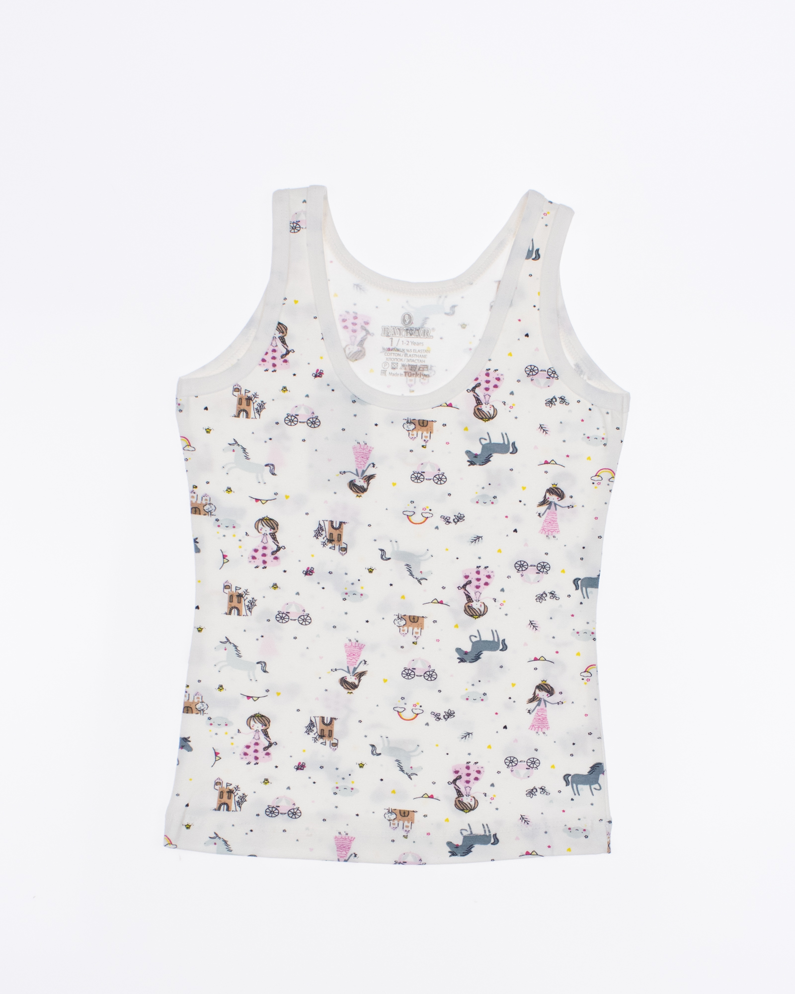 Лямочки мягко облегают плечи, фиксируют изделие в едином положении на протяжении дня, из-за чего одежда не задирается, не сползает, не перекручивается. Силуэт слегка прилегает к телу, из-за чего белье носится и полными, и худенькими девочками.. Постельный цвет маечки приятно смотрится, а принт на переднем полотне добавляет образу свежести, аккуратности и нежности. Детская одежда носится как ночнушка, нижнее белье или как белье для повседневной носки дома, в школу.